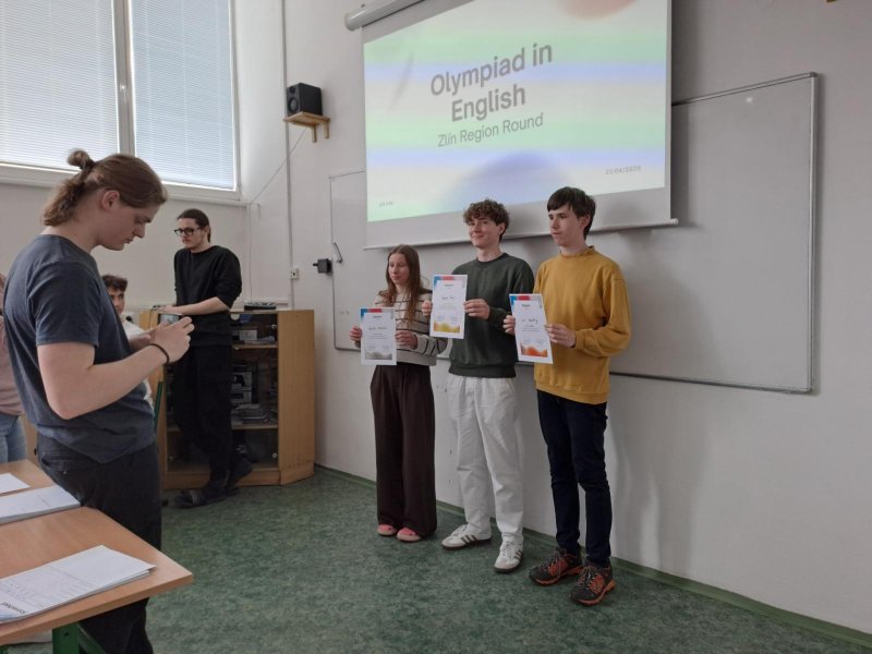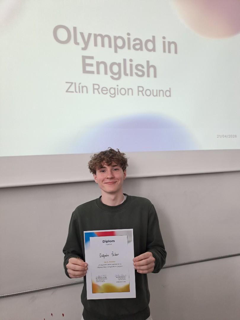 21. dubna se ve Zlíně uskutečnil další ročník olympiády v anglickém jazyce. Po skvělém 3. místě v loňském roce se Štěpánu Šilerovi ze 7.B tentokrát podařilo získat prvenství v konkurenci 7 dalších soutěžících vyslaných z okresů Zlínského kraje. Štěpán tak postupuje do celonárodního kola, které se bude konat v červnu. Děkujeme za výbornou reprezentaci školy!